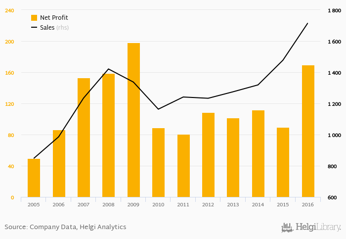 Sales have grown by 5.7% a year on average since 2006. They reached a high of CZK 1,716 mil in 2016 and a low of CZK 847 mil in 2005.