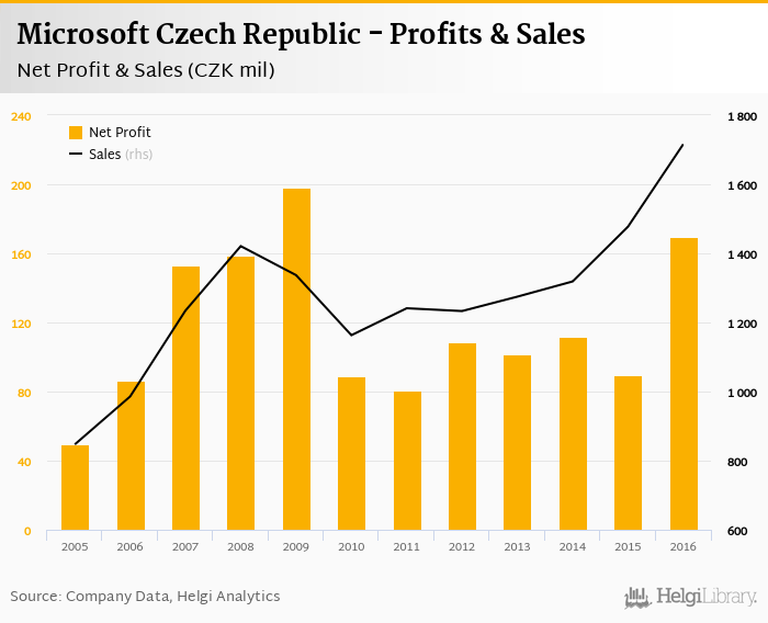 Microsoft Czech Republic made a net profit of CZK 170 mil in 2016, up 89.6% compared to the previous year. Total sales reached CZK 1,716 mil, which is up 16.2% when compared to the previous year.