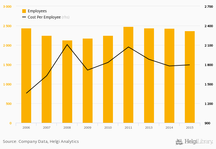 Staff cost represented of sales in 2015, 0 pp higher than a decade ago.