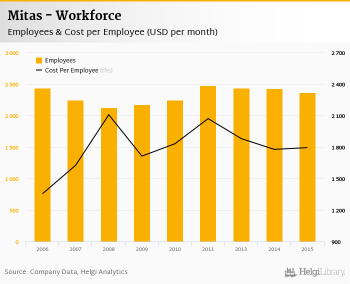 Mitas employed 2,369 employees in 2015, down 2.59% compared to the previous year. Historically, between 2006 and 2015, the firm's workforce hit a high of 2,476 employees in 2011 and a low of 2,124 employees in 2008.
