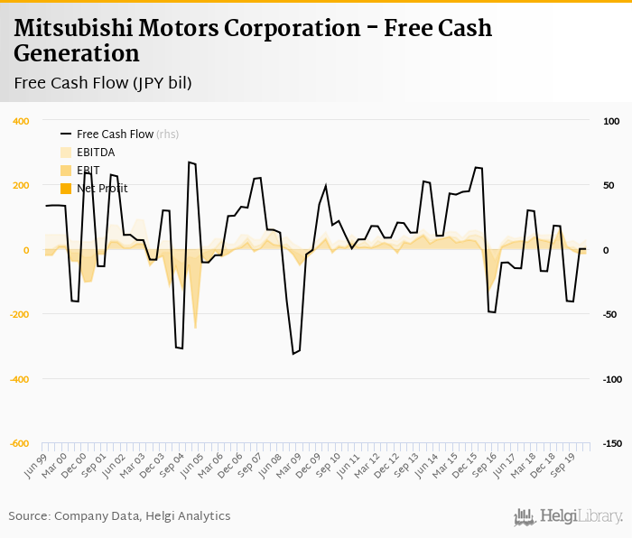 Mitsubishi Motors Corporation made a net profit of JPY -14.0 bil with revenues of JPY 603 bil in 1Q2020, down by 122% and down by 16.3%, respectively, compared to the previous year. This translates into a net margin of -2.32%.