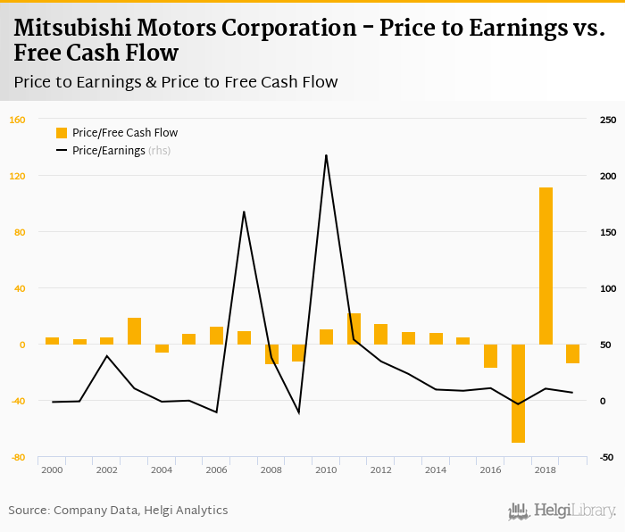 Regarding cash generated defined by the sum of net profit and depreciation, the stock traded at x at the end of 2019. When investments are excluded to get free cash flow, Mitsubishi Motors Corporation traded at -13.6x.