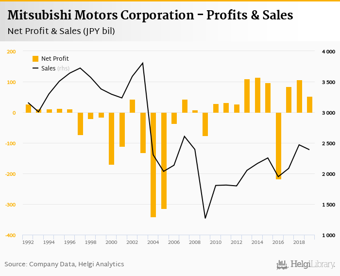 Mitsubishi Motors Corporation made a net profit of JPY 51.9 bil in 2019, down 51.3% compared to the previous year. Total sales reached JPY 2,387 bil, which is down 3.28% when compared to the previous year.