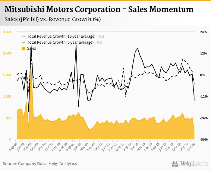 Mitsubishi Motors Corporation generated sales of JPY 230 bil in 2Q2020, down 57.2% compared to the previous year. Historically, between 3Q1991 and 2Q2020, the company’s sales reached a high of JPY 1,971 bil in 1Q2003 and a low of JPY 230 bil in 2Q2020.