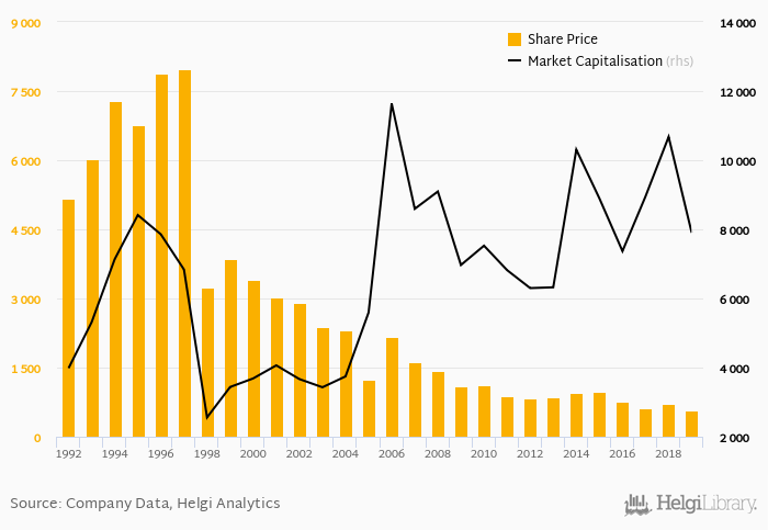 Since the end of 2014, stock has appreciated by -39.8% implying an annual average growth of -9.67% In absolute terms, the value of the company fell by USD 2,404 mil.