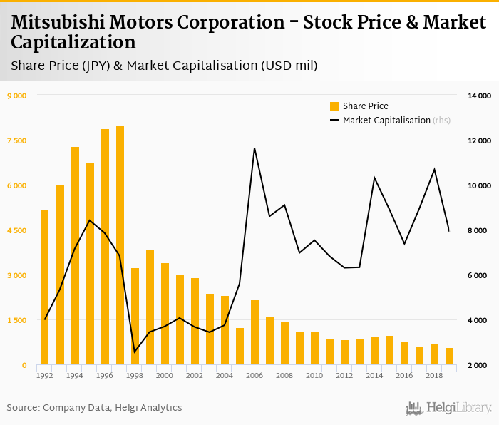 Mitsubishi Motors Corporation stock traded at JPY 576 per share at the end 2019 implying a market capitalization of USD 7,900 mil.