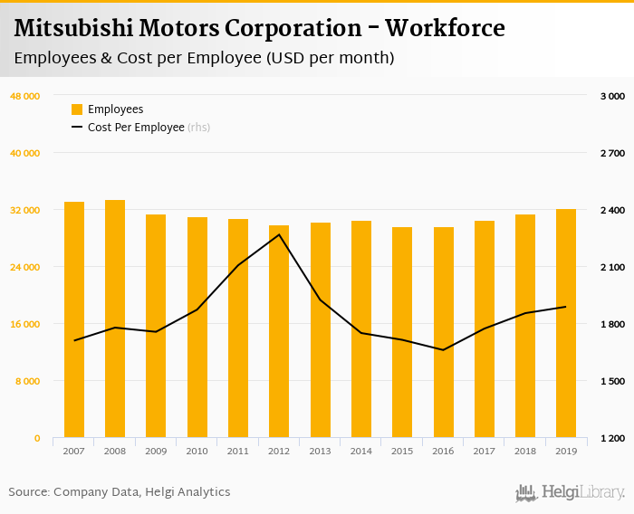 Mitsubishi Motors Corporation employed 32,171 employees in 2019, up 2.74% compared to the previous year. Historically, between 1999 and 2019, the firm's workforce hit a high of 65,485 employees in 1999 and a low of 29,555 employees in 2015.