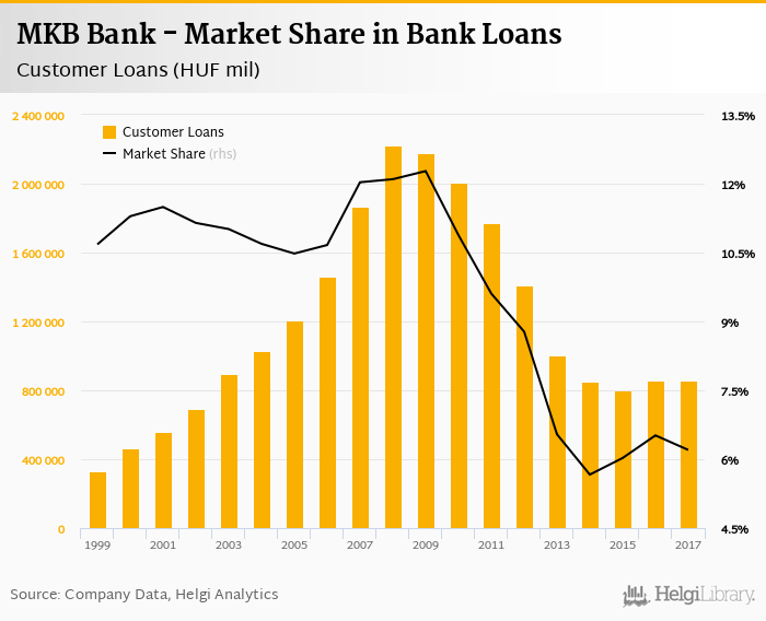 MKB Bank accounted for 6.20% of all customer loans issued in Hungary at the end of 2017. Historically, the bank’s market share in customer loans reached an all time high of 12.3% in 2009 and an all time low of 5.66% in 2014.