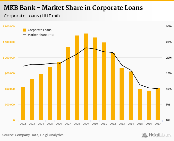 MKB Bank accounted for 9.98% of all corporate loans issued in Hungary at the end of 2017. Historically, the bank’s market share in corporate loans reached an all time high of 23.1% in 2009 and an all time low of 9.98% in 2017.