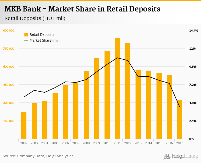 MKB Bank accounted for 4.19% of all retail deposits taken by banks in Hungary at the end of 2017. Historically, the bank’s market share in retail deposits reached an all time high of 10.7% in 2011 and an all time low of 4.19% in 2017.