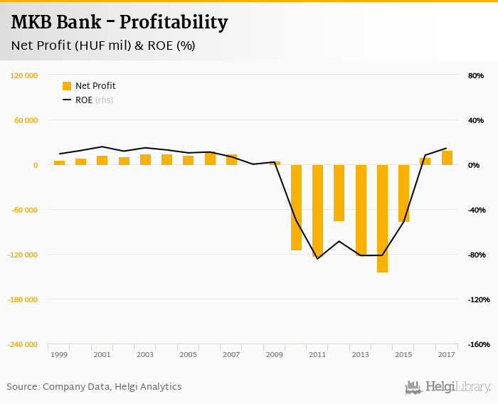 MKB Bank made a net profit of HUF 19,201 mil in 2017, up 102% compared to the previous year. This implies a return on equity of 14.4%.