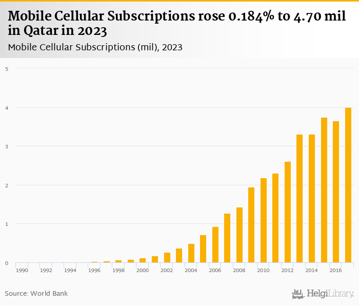 Mobile cellular subscriptions rose 0.184% to 4.70 mil in Qatar in 2023, according to World Bank.