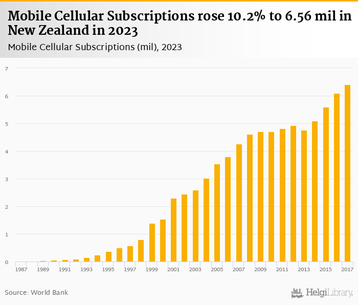 Mobile cellular subscriptions rose 10.2% to 6.56 mil in New Zealand in 2023, according to World Bank.