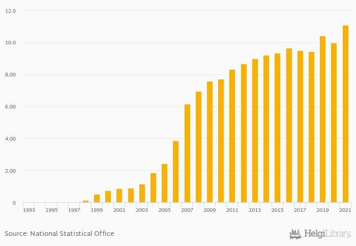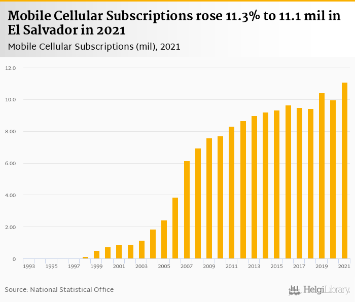 Mobile cellular subscriptions rose 11.3% to 11.1 mil in El Salvador in 2021, according to World Bank.