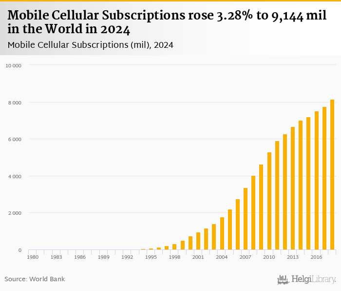 Mobile cellular subscriptions rose 3.28% to 9,144 mil in the World in 2024, according to World Bank.