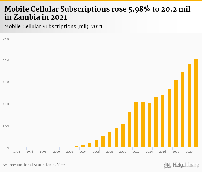 Mobile cellular subscriptions rose 5.98% to 20.2 mil in Zambia in 2021, according to World Bank.