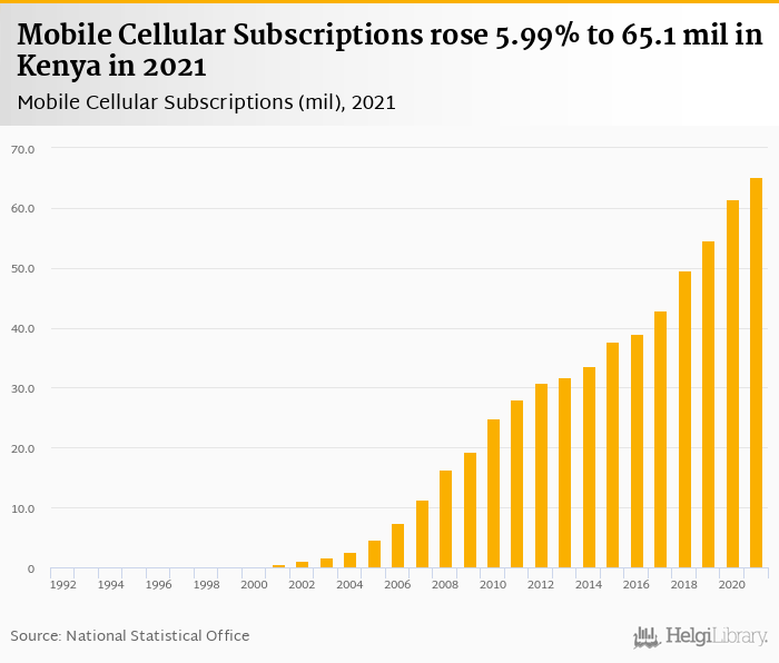 Mobile cellular subscriptions rose 5.99% to 65.1 mil in Kenya in 2021, according to World Bank.