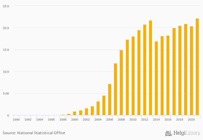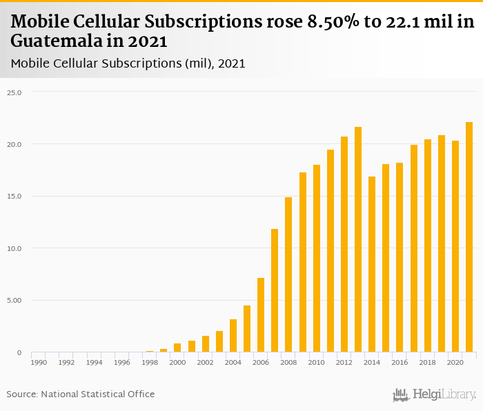 Mobile cellular subscriptions rose 8.50% to 22.1 mil in Guatemala in 2021, according to World Bank.