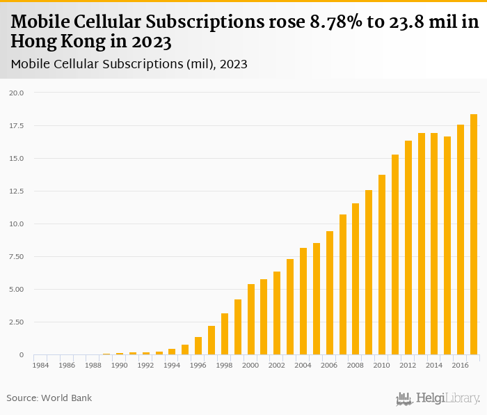 Mobile cellular subscriptions rose 8.78% to 23.8 mil in Hong Kong in 2023, according to World Bank.