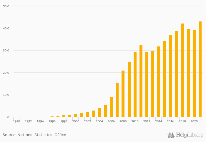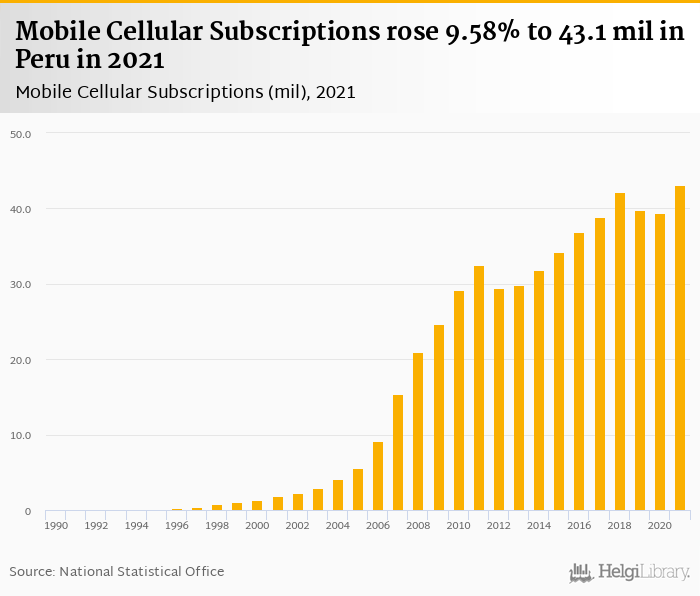Mobile cellular subscriptions rose 9.58% to 43.1 mil in Peru in 2021, according to World Bank.