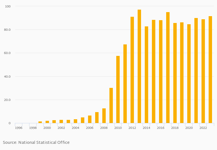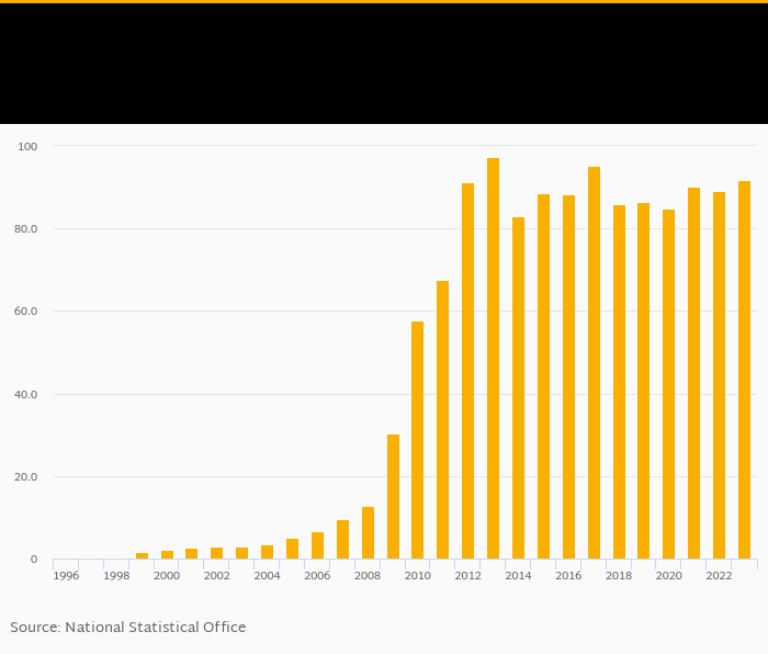 Mobile phone penetration as a percentage of population rose 2.96% to 91.6% in Zimbabwe in 2023, according to World Bank.