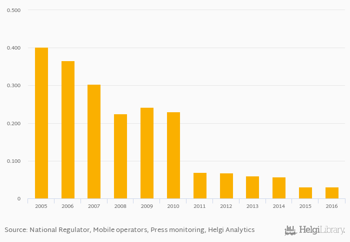 Historically, mobile termination rates (MTR) in Israel reached an all time high of ILS 0.402 in 2005 and an all time low of ILS 0.030 in 2015.