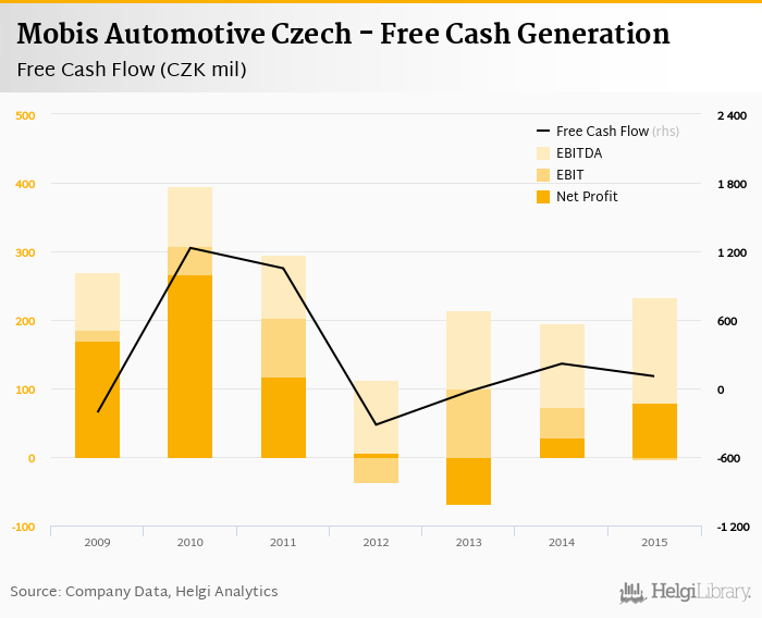 Mobis Automotive Czech made a net profit of CZK 80.0 mil with revenues of CZK 30,338 mil in 2015, up by 178% and up by 26.1%, respectively, compared to the previous year. This translates into a net margin of 0.264%.