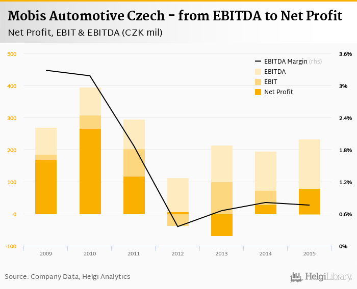 As far as Mobis Automotive Czech's peers are concerned, Varroc Lighting Systems Czech Republic posted net and EBITDA margin of 4.32% and 7.60%, respectively in 2015, Automotive Lighting generated margins of 9.57% and 12.9% and Continental Automotive Czech Republic profit margin reached 1.43% on the net and 12.9% on the EBITDA level in 2019.