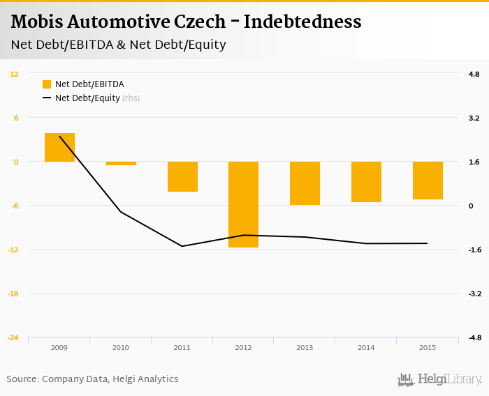 Mobis Automotive Czech's net debt stood at CZK -1,189 mil and accounted for -1.40 of equity at the end of 2015. The ratio is up 0.007 pp compared to the previous year.