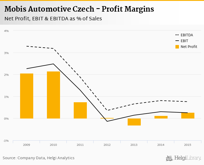 Mobis Automotive Czech made a net profit of CZK 80.0 mil with revenues of CZK 30,338 mil in 2015, up by 178% and up by 26.1%, respectively, compared to the previous year.
