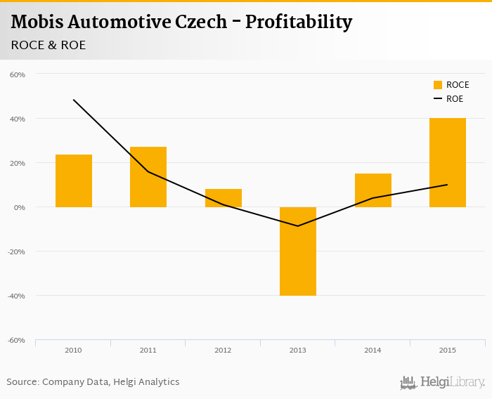As far as Mobis Automotive Czech's peers are concerned, Varroc Lighting Systems Czech Republic generated ROE of 28.0% and ROCE of 17.8% in 2015. Automotive Lighting's profitability reached 46.9% and 47.7%, respectively. Continental Automotive Czech Republic operated with 7.08% and 2.02% returns in 2015.