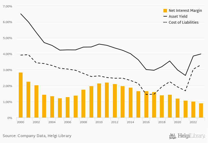 Historically, the bank’s net interest margin reached an all time high of 2.83% in 2000 and an all time low of 0.913% in 2023. The average margin in the last five years amounted to 1.13%.