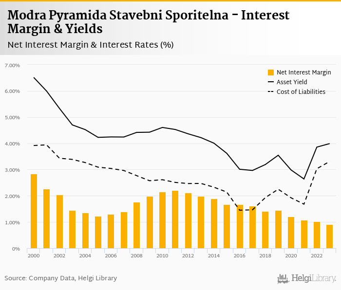 Comparing Modra Pyramida Stavebni Sporitelna with its closest peers, CSOB Stavebni Sporitelna operated in 2023 with a net interest margin of 1.63% in 2023,.