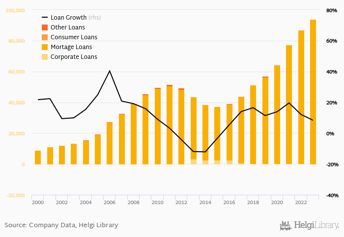 Mortgage loans represented 99.8% of the bank's loan book at the end of the year 2023, consumer further 0% and corporate loans 0.214% of total loans.