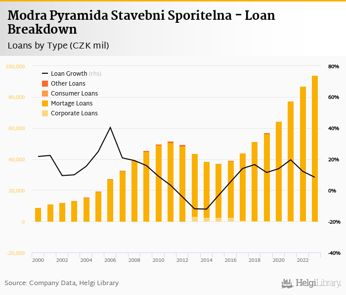 Modra Pyramida Stavebni Sporitelna's loans reached CZK 94,094 mil in the 2023, up from CZK 86,844 mil compared to the previous year. Historically, the bank’s loans reached an all time high of CZK 94,094 mil in 2023 and an all time low of CZK 9,086 mil in 2000.