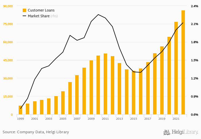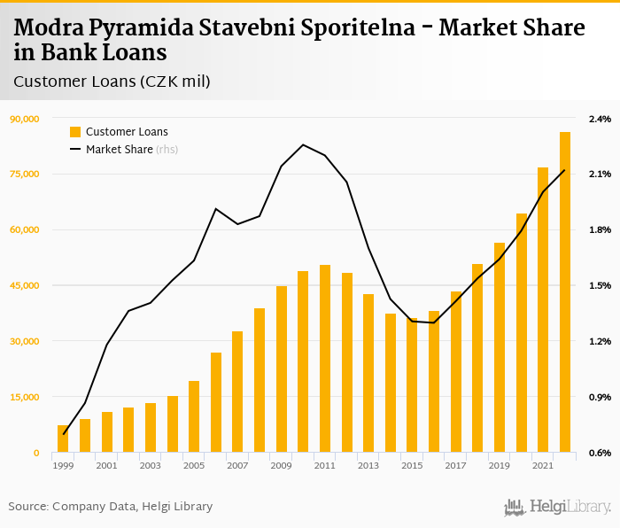 Modra Pyramida Stavebni Sporitelna accounted for 2.12% of all customer loans issued in Czechia at the end of 2022. Historically, the bank’s market share in customer loans reached an all time high of 2.25% in 2010 and an all time low of 0.692% in 1999.
