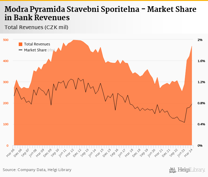 Modra Pyramida Stavebni Sporitelna generated total banking revenues of CZK 469 mil in 2024-03-31, up 11.4% compared to the previous year.