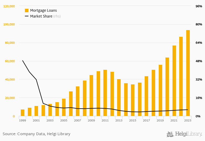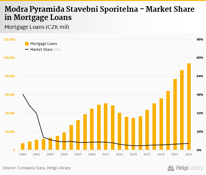 Modra Pyramida Stavebni Sporitelna accounted for 5.39% of all mortgage loans issued in Czechia at the end of 2023. Historically, the bank’s market share in mortgage loans reached an all time high of 48.4% in 1999 and an all time low of 3.47% in 2016.