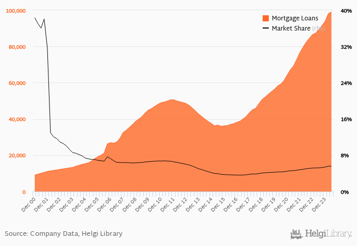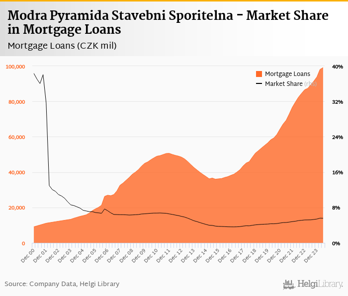 Modra Pyramida Stavebni Sporitelna accounted for 5.58% of all mortgage loans issued in Czechia at the end of 2Q2024. Historically, the bank’s market share in mortgage loans reached an all time high of 38.3% in 4Q2000 and an all time low of 3.62% in 1Q2017.
