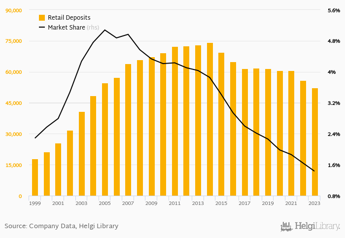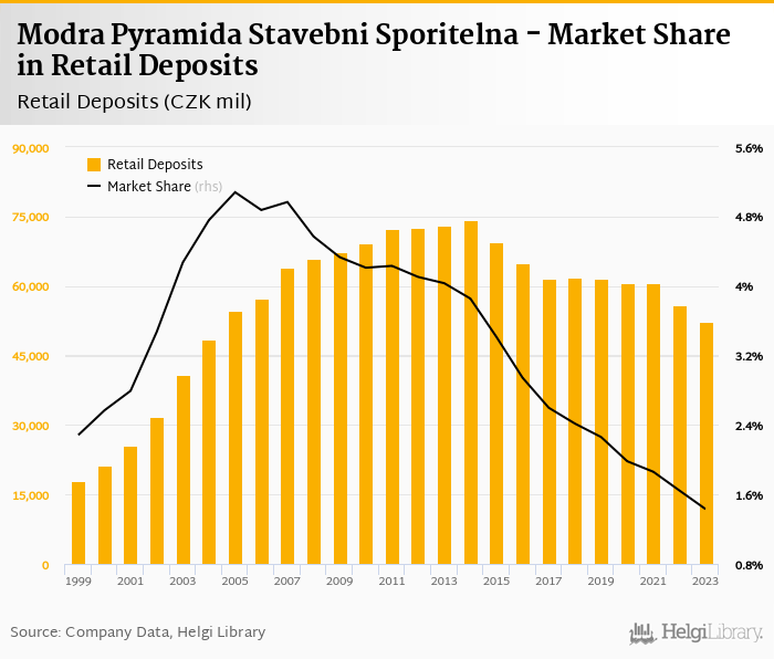 Modra Pyramida Stavebni Sporitelna's retail deposits reached CZK 52,237 mil in 2023, down 6.48% compared to the previous year.