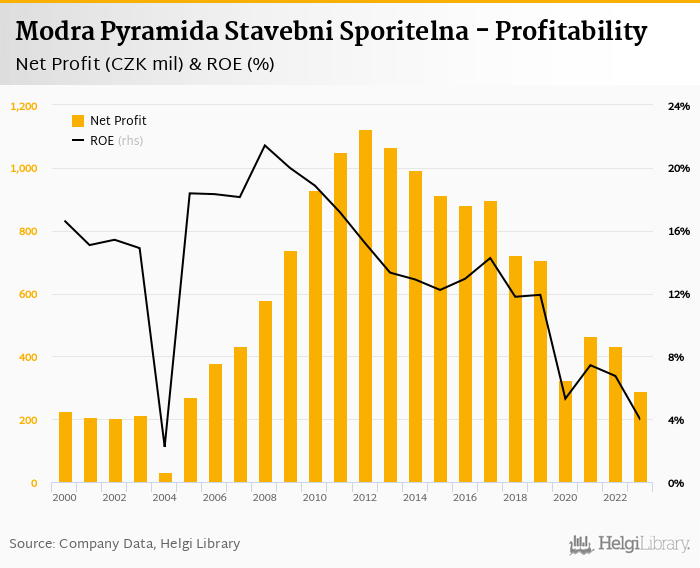 Modra Pyramida Stavebni Sporitelna made a net profit of CZK 290 mil in 2023, down 33.1% compared to the previous year. This implies a return on equity of 3.95%.