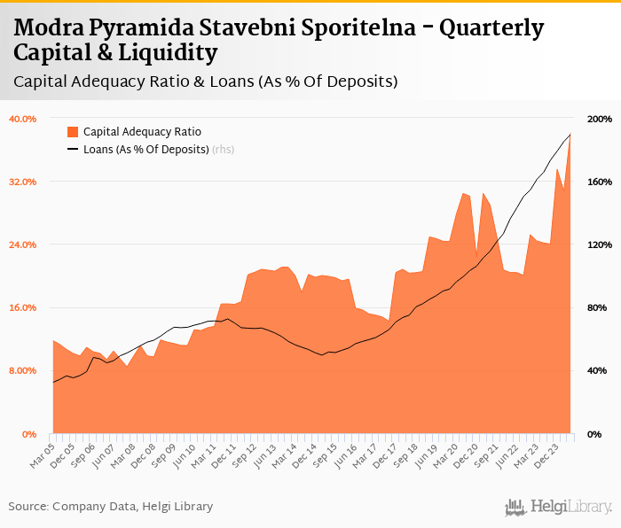 Modra Pyramida Stavebni Sporitelna's capital adequacy ratio reached 38.1% at the end of second quarter of 2024, up from 30.7% when compared to the previous quarter. Historically, the bank’s capital ratio hit an all time high of 38.1% in 2Q2024 and an all time low of 8.42% in 4Q2007.