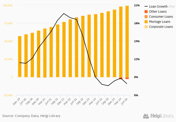 Mortgage loans represented 103% of the bank's loan book at the end of the year 2Q2024, consumer further 0% and corporate loans 0.166% of total loans.