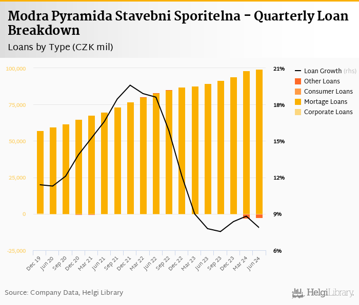 At the end of second quarter of 2024, Modra Pyramida Stavebni Sporitelna's loans accounted for 189% of total deposits and 90.5% of total assets.