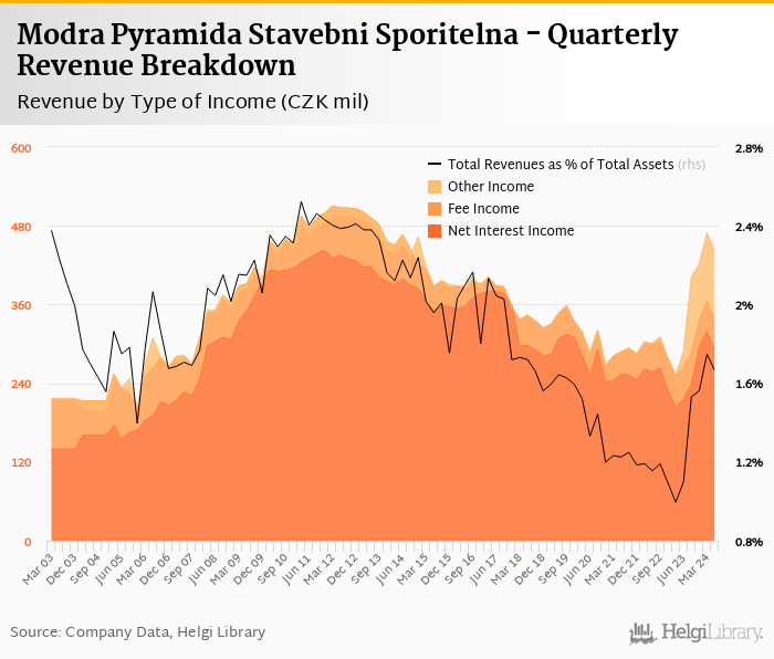 Modra Pyramida Stavebni Sporitelna generated total banking revenues of CZK 442 mil in the second quarter of 2024, up 52.8% when compared to the same period of last year and down 5.89% when compared to the previous quarter.
