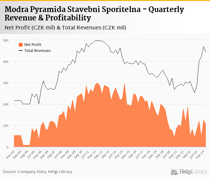 Modra Pyramida Stavebni Sporitelna made a net profit of CZK 104 mil under revenues of CZK 442 mil in the second quarter of 2024, up 26.7% and 52.8% respectively when compared to the same period last year.