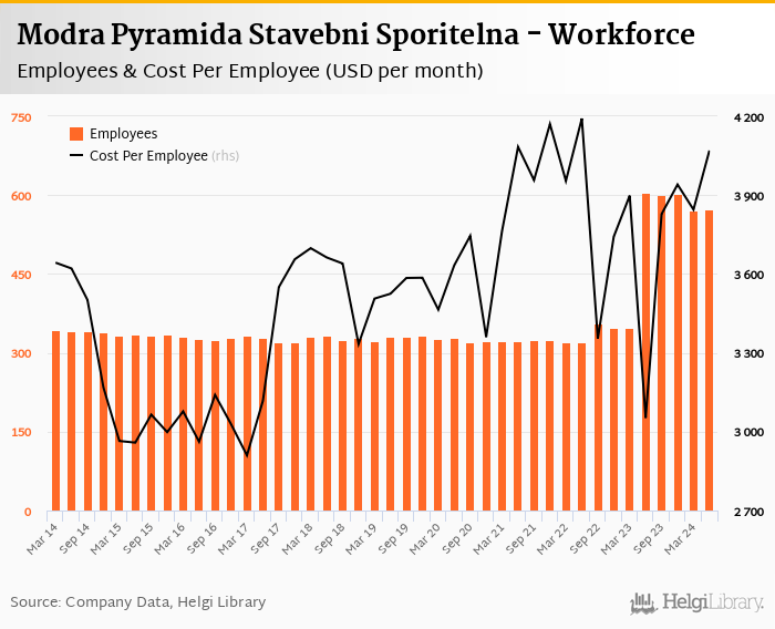 Modra Pyramida Stavebni Sporitelna employed 572 persons in 2024-06-30, up 0.175% when compared to the previous year. Historically, the bank's workforce hit an all time high of 605 persons in 2023-06-30 and an all time low of 320 in 2022-03-31.
