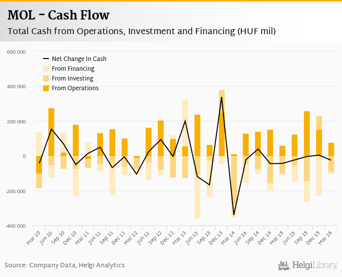 MOL's operating cash flow stood at HUF 77,543 mil in 1Q2016, up 30.8% when compared to the previous year. Historically, between 1Q2010 - 1Q2016, the firm’s operating cash flow reached a high of HUF 276,146 mil in 2Q2010 and a low of HUF -99,223 mil in 1Q2010.