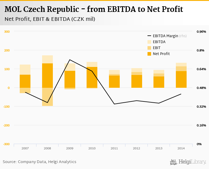 MOL Czech Republic made a net profit of CZK 89.3 mil with revenues of CZK 31,309 mil in 2014, up by 46.2% and up by 14.7%, respectively, compared to the previous year. This translates into a net margin of 0.285%.