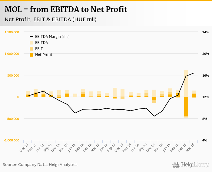 MOL made a net profit of HUF 77,177 mil with revenues of HUF 699,362 mil in 1Q2016, up by 118% and down by 24.8%, respectively, compared to the previous year. This translates into a net margin of -5.37%.